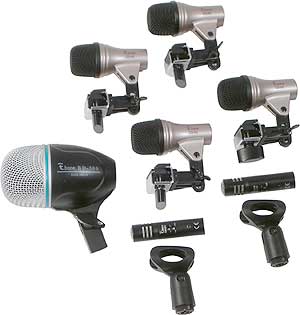bestehend aus dynamischen Bass Drum Mikro BD300, 4 x dynamischen Snare/Tom CD65 mit spezieller Rimklemme und 2x EM500 Overhead-Kondensatormikrophon, Set im Koffer!